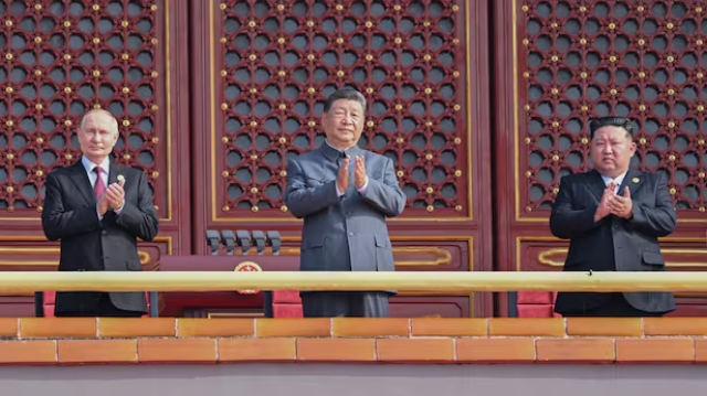 式典は国営中央テレビが生中継し、午前9時(同10時)にスタート。ロシアのプーチン大統領、北朝鮮の金正恩朝鮮労働党総書記を含む20カ国以上の首脳らが出席した。パレードに先立ち、習、正恩両氏は握手し、短く言葉を交わした。さらに、プーチン氏と共に3首脳が天安門楼上で並んだ。中ロ朝の首脳がそろうのは極めて異例で、3カ国の結束をアピールする形となった。- 76