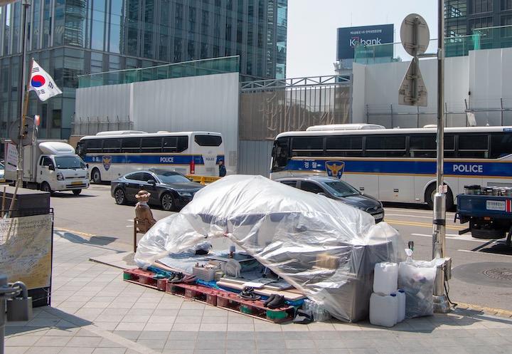 活動家らは19日、「野宿抗議を中断する心境を問われれば、むしろ怒りが込み上げる」としたうえ「政権が交代しても、戦争に反対し平和を志向する反日行動に対する弾圧はより強まっている」と述べた。