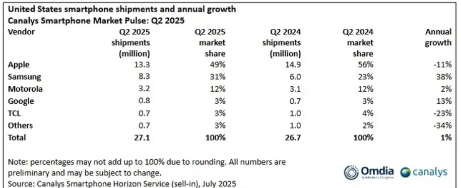29日、市場調査業者カナリスによると、第2四半期の主要スマートフォンメーカーの米国市場占有率はアップルが49%で1位を記録し、サムスンが31%で後に続いた。 モトローラは12%、グーグルとTCLはそれぞれ3%で、その他のメーカーの合算シェアは3%だった。