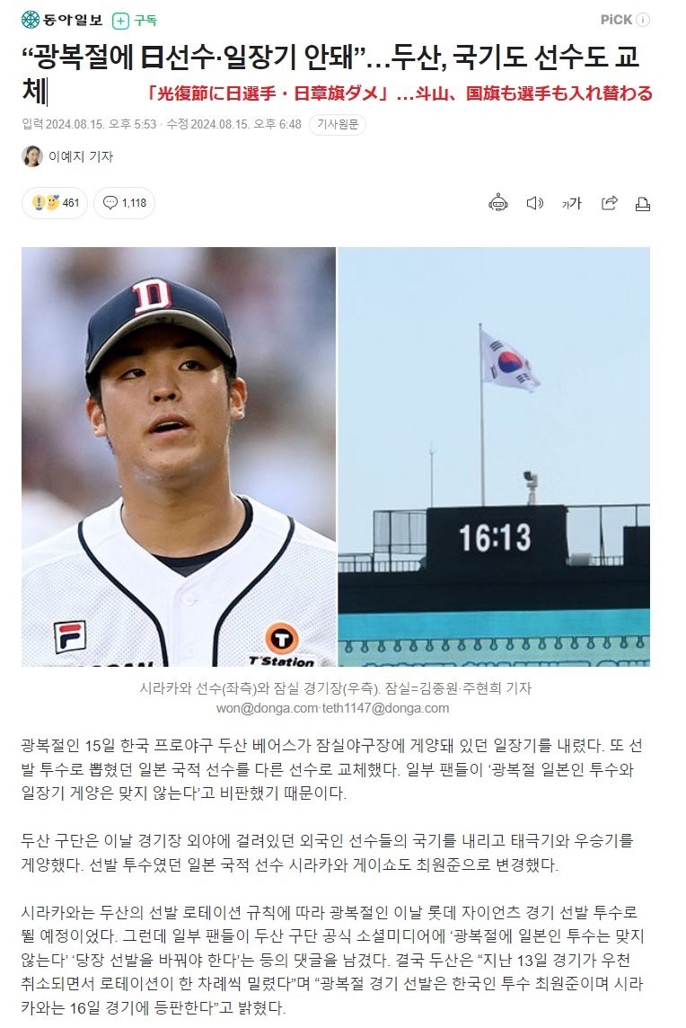 記事によると、始球式発表後にネット上では「光復節を控えたタイミングでやることではない」といった抗議の声が殺到したという。