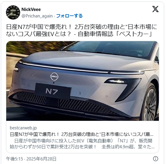 その点、日本は国内向けに軽自動車モデルもあるからさ。価格が半分くらいで、値引きされた中国EVの同クラスと比べても大して価格差も無い。中国EVが100万円くらいで売り出されれば、手を出す人もいるかもしれないけど、高々数十万円の差で中国車を選ぶ日本人は居ない。>>17
