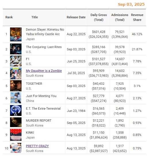 韓国での『鬼滅の刃:無限城編』の公開(8/22)以来、全売上の半分以上が『鬼滅』という状態が続いていたわけですが、新作のハリウッド映画が公開されて、やっと50%を割りました。