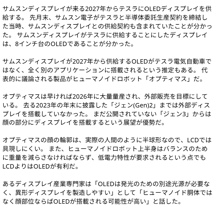 サムスンディスプレイが2027年から供給するOLEDがテスラ電気自動車ではなく、全く別のアプリケーションに搭載されるという推定もある。 代表的に議論される製品がヒューマノイドロボット「オプティマス」だ。