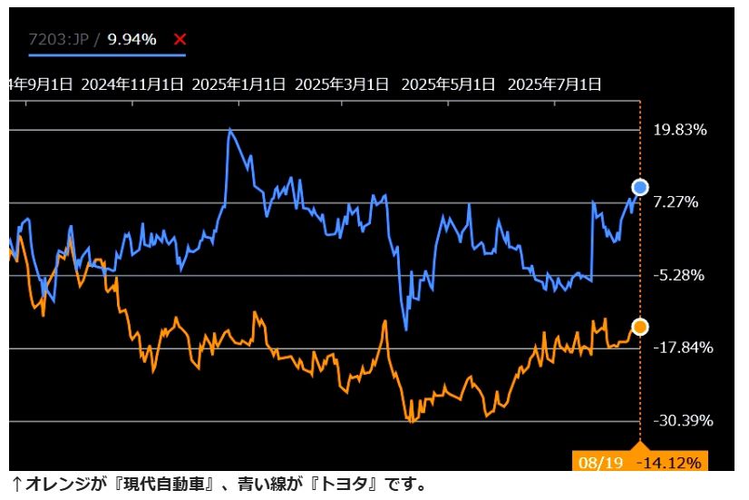 残念でしたね壁貼り君wwwここ1年のトヨタと現代の株価の推移。