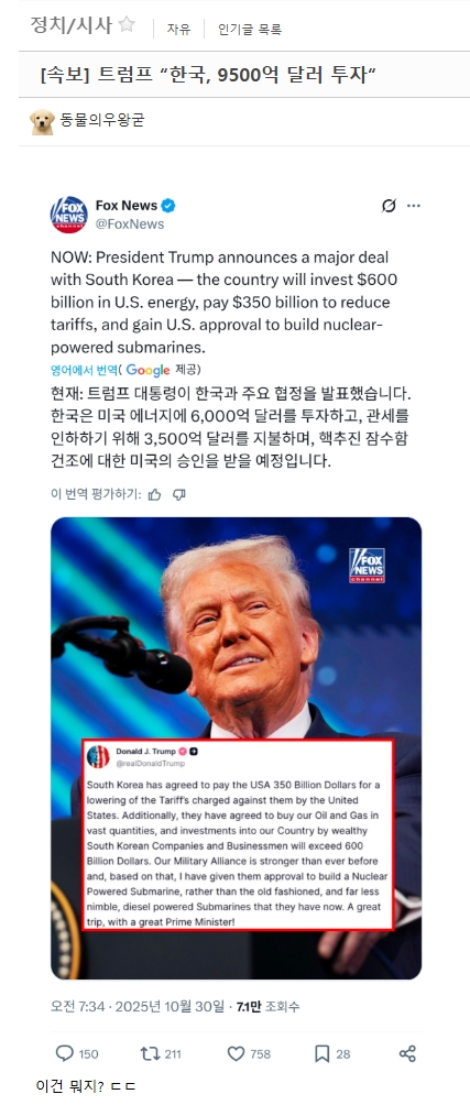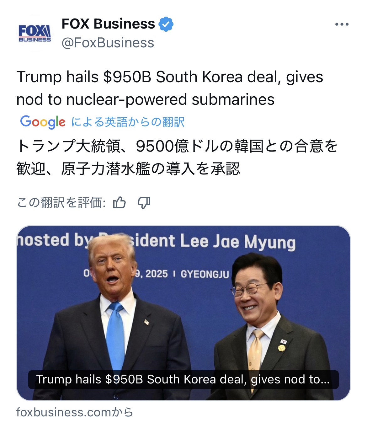 韓国人、息してるか?😂President Trump announces a major deal with South Korea — the country will invest $600 billion in U.S. energy, pay $350 billion to reduce tariffs, and gain U.S. approval to build nuclear-powered submarines.