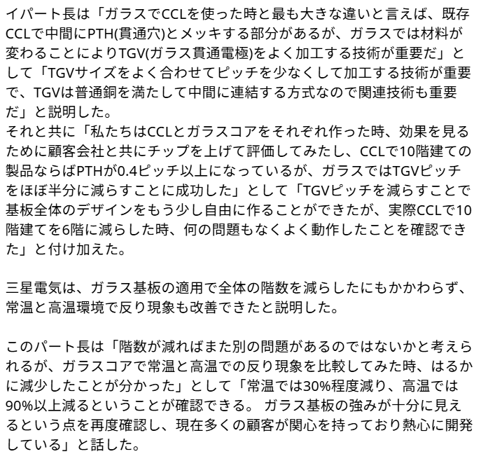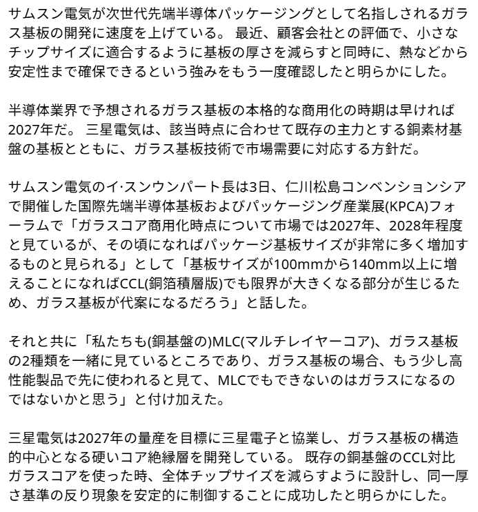 日本電気硝子という企業が去年からサンプル出荷始めているよ(笑)東京エレクトロンは周知の通り半導体製造装置を供給する企業だけれどここも硝子基盤を使った製造装置を開発製品化を始めている(笑)焼け石に水の黒字を誇る韓国人に草生えるw