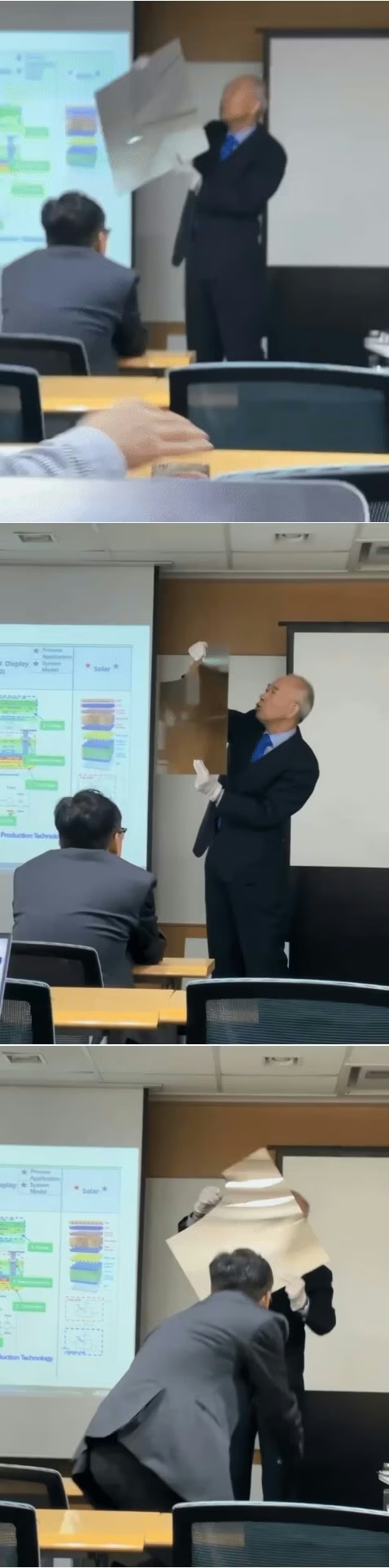 半導体製造装置メーカー「ジュソン・エンジニアリング(JUSUNG Engineering Co., Ltd.)」の会長が自社の技術を発表する場で、ガラス基板を割ってしまうという想定外の事態が発生した。