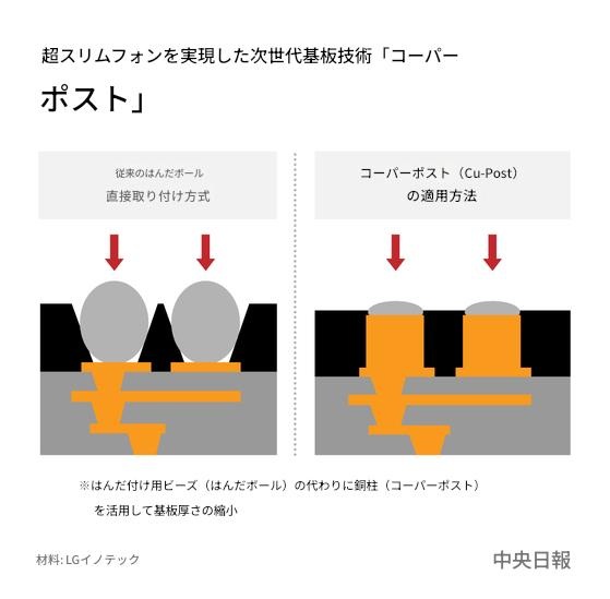 LG이노텍은 구슬 대신 구리 기둥(코퍼 포스트)을 먼저 세우고 그 위에 작은 반원형 솔더볼을 얹는 방식을 고안해냈다. 이러한 기둥 구조를 적용할 경우 면적과 크기가 줄어들어 최대 20%가량 작은 반도체 기판 제조가 가능하다.