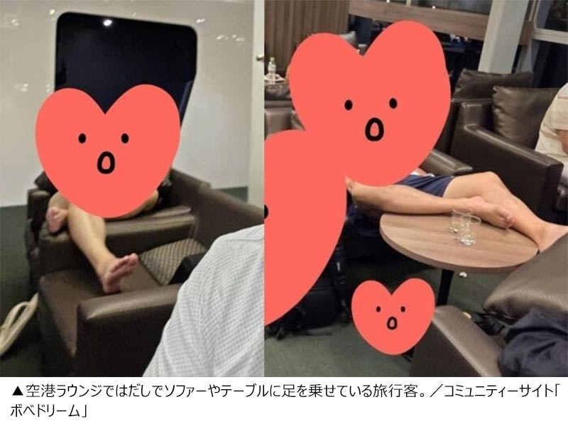 写真には、韓国人と推定される旅行客が空港ラウンジで靴を脱ぎ、ソファやテーブルに足を乗せて休んでいる様子が写っていていた。