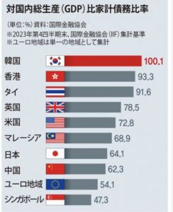 だが、50%を上回る時期は今年の第1次補正予算の編成で27年に、今回の追加補正予算の編成で26年に、さらに短縮する見通しだ。追加補正予算により政府債務は1,300兆6,000億ウォン(約139兆円)に増え、対GDP比は26年に50.3%に達すると予測される。日本のバブル崩壊直前に酷似する韓国の民間債務、実態は当時の日本より深刻