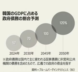 お前バカだろ韓国の政府債務の対国内総生産(GDP)比が、2026年にも初めて50%を上回る見通しだ。25年に入り2度の補正予算が編成されたためで、今後も財政拡張が続けば財政状況の悪化は避けられない見通しだ。