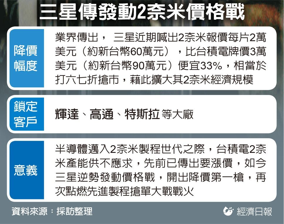 業界筋によると、サムスンは最近、2nmウェハ1枚あたり2万ドル(約60万台湾ドル)の価格を提示した。これはTSMC (2330)の定価3万ドル(約90万台湾ドル)より33%安い。これは、市場シェア獲得のため、NVIDIA、Qualcomm、Teslaなどの大手メーカーからの受注獲得とTSMCからの人材引き抜きを狙った、60%から70%の値引きに相当する。
