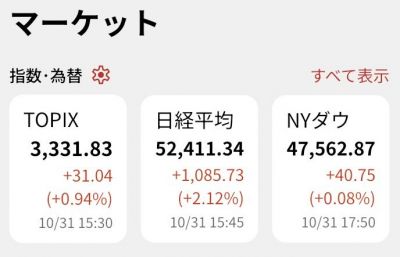 自民党総裁選で高市早苗氏が勝利したことを受け、株高ピッチが強まり、取引時間中の最高値を更新した。48500超えたね