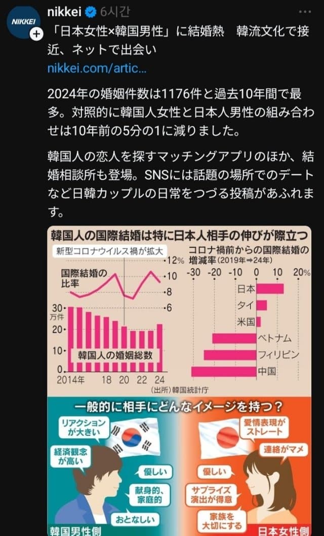 ここ3年間(2022~2024年)で国際結婚件数が着実に増加しているが、2024年の統計によると、韓国人男性が外国人女性を妻に迎える割合は74.7%に達した。特に、韓国人男性と日本人女性の国際結婚は前年に比べて40%も増加して注目を集めた。日本メディアも韓国人男性と日本人女性の結婚の話題を深く取り上げるほど関心を寄せている。