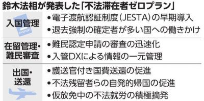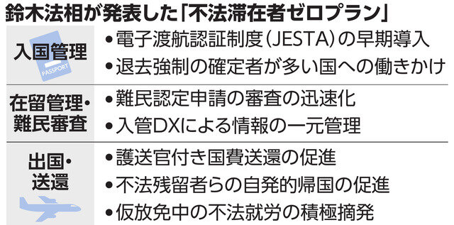 ゼロ計画は5月23日に公表され、不法滞在者約7万人のうち、強制送還が確定しながら帰国を拒否する「送還忌避者」約3千人を5年半で半減させるとの目標を掲げる。