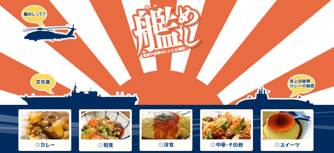 レシピサイトをリニューアル。名前は『艦めし』。艦艇や部隊からオリジナルレシピを集めました。カレーだけでなく和洋中・スイーツのレシピ約100種を掲載。ぜひお試しください! #艦めし #海自カレー #海上自衛隊 #レシピ ⇒ http://www.mod.go.jp/msdf/kanmeshi/