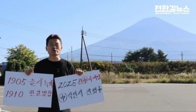 チョン氏は17日、「1905年乙巳勒約(第二次日韓協約)」と「1910年韓日併合」と書かれたプラカード、そして「2025年親中・李在明」と書かれたプラカードを持ち、富士山を背景に立つ姿を撮影した動画を自身のYouTube(ユーチューブ)チャンネルに投稿した。