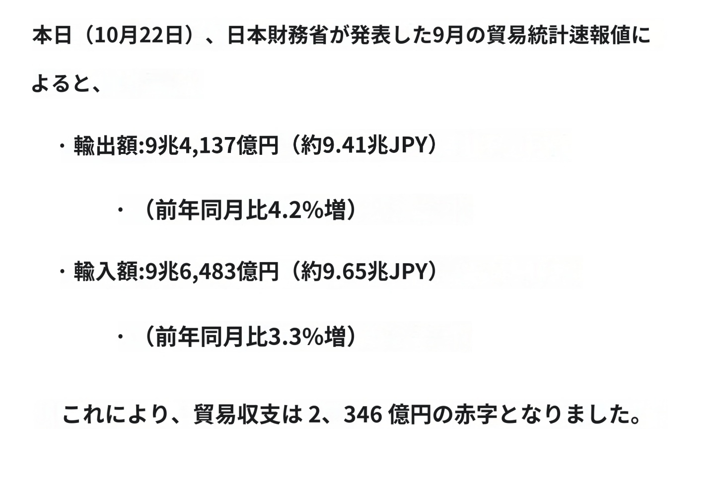 1ㅇㅇ2025/10/22(Wed) 10:20:43ID:Q1MzAwNzA(1/1)NG報告일본 9월 수출액 88조 8000억원무역수지 2.2조원 적자한국 9월 수출액 94조 2000억원무역수지 13.6조원 흑자3개월 연속 추월>>2>>5>>440
