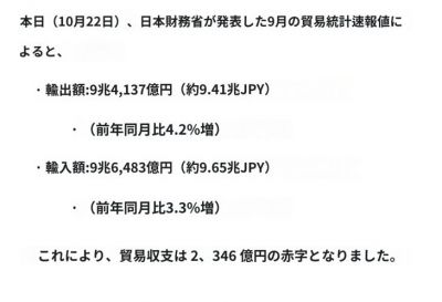 1ㅇㅇ2025/10/22(Wed) 10:20:43ID:Q1MzAwNzA(1/1)NG報告일본 9월 수출액 88조 8000억원무역수지 2.2조원 적자한국 9월 수출액 94조 2000억원무역수지 13.6조원 흑자3개월 연속 추월>>2>>50
