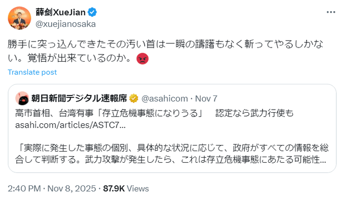 中国の 薛剣・駐大阪総領事が、高市首相が中国による台湾の海上封鎖が発生した場合に「存立危機事態になり得る」と答弁したことに対し、「その汚い首は一瞬の 躊躇ちゅうちょ もなく斬ってやるしかない」と自身のX(旧ツイッター)に投稿していたことが分かった。