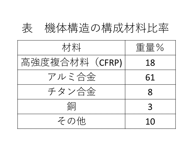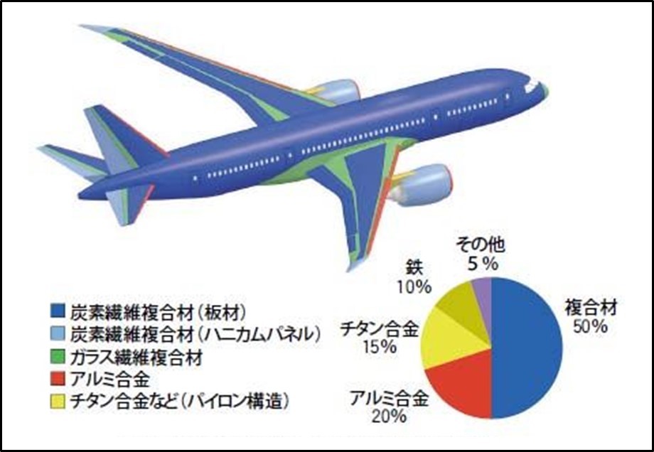 米国ボーイングの中型ワイドボディ機B787では機体材料に占めるアルミニウム合金の重量比が20%に減少し、複合材料(CFRP、GFRPなど)の重量比が50%に高まった。
