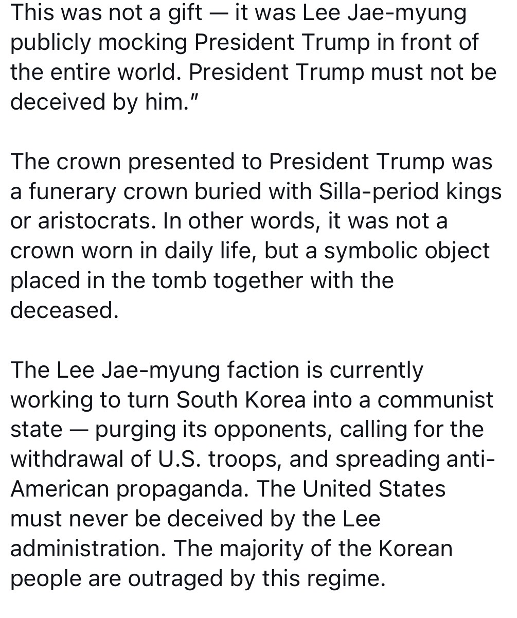 イ・ジェミョン派は現在、韓国を共産主義国家に変えようとしている — 反対者を粛清し、米軍の撤退を求め、反米プロパガンダを広めている。米国は決してイ政権に騙されてはいけない。韓国の国民の大多数はこの政権に激怒している。