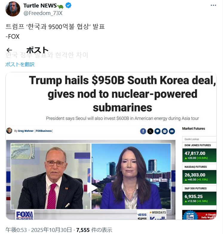 トランプ「原子力潜水艦の建造を承認する、技術も核燃料もアメリカが提供する、その代わりアメリカへの投資額6,000億ドル追加な」