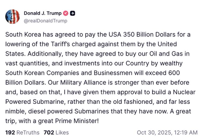 NOW: President Trump announces a major deal with South Korea — the country will invest $600 billion in U.S. energy, pay $350 billion to reduce tariffs, and gain U.S. approval to build nuclear-powered submarines.