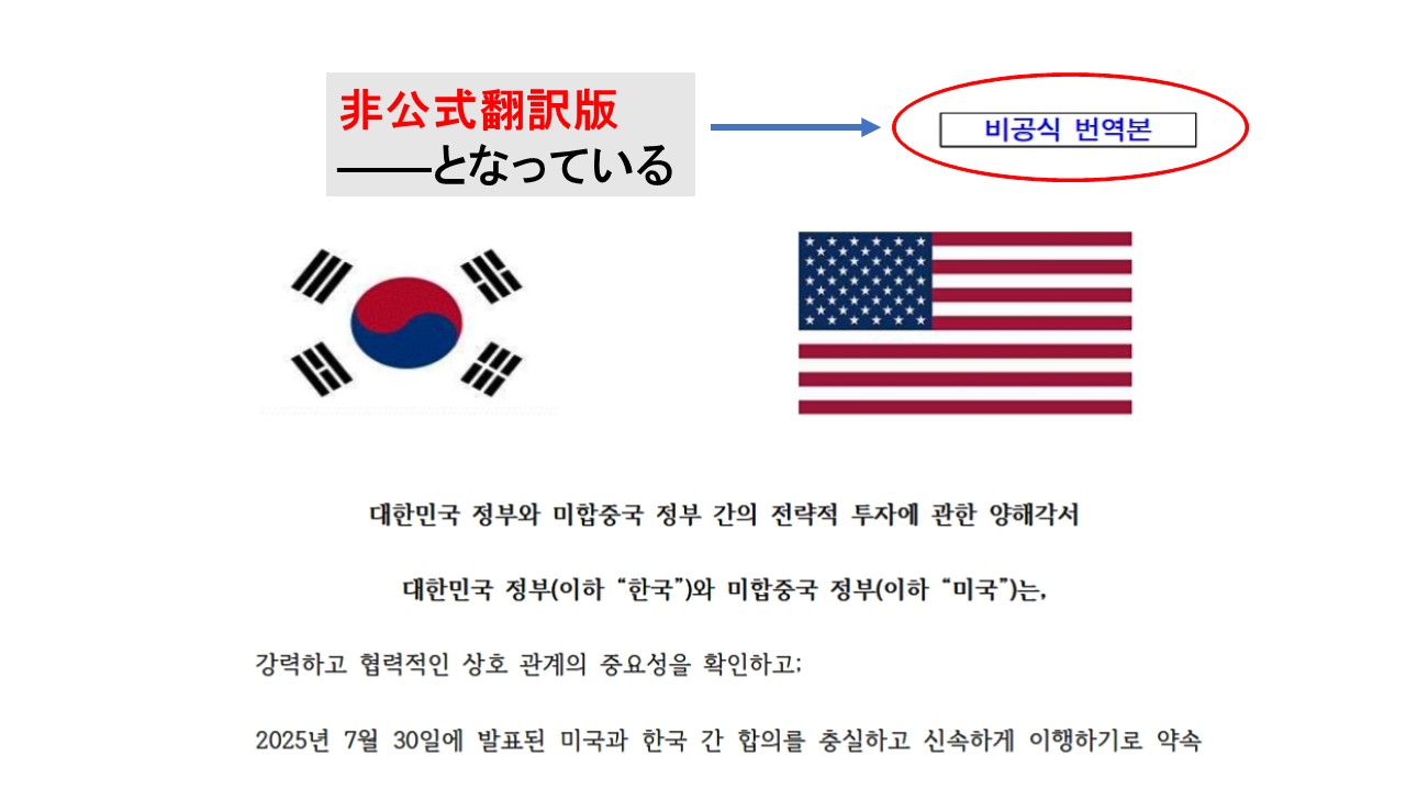 先にご紹介したとおり、韓国の産業通商資源部は「MOUは締結された」として、その内容を公開したのですが(2025年11月14日)、そこには「非公式翻訳版」と書かれています。