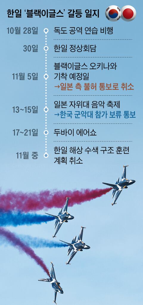 韓国と日本は歴史問題と領土問題で毎年同じ時期に対立を繰り返している。日本政府の歴史教科書検定発表(3月)、外交青書発行(4月)、防衛白書公開(7月)などだ。しかしブラックイーグルス問題は両首脳が「未来志向の協力」で一致した直後に表面化した。外交当局としては想定していなかった事態だ。