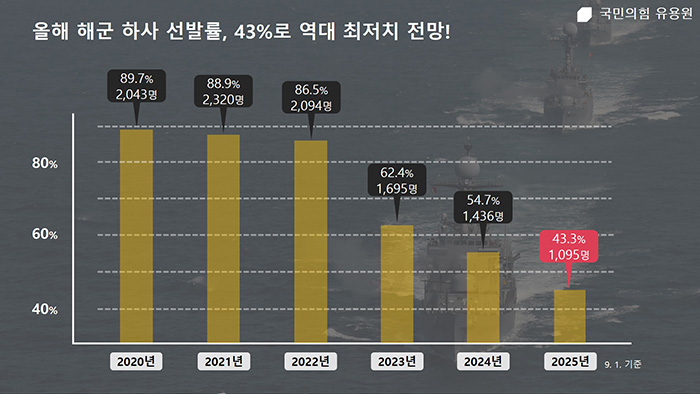 国会国民の力国防委員会有用院国会議員(比例代表)が海軍本部から提出された「主要艦艇別幹部保職率現況」資料によると、現在の下士階級保職率が著しく低く、海軍と犯政府が緊密に協議を通じて案を設けなければならないと指摘。