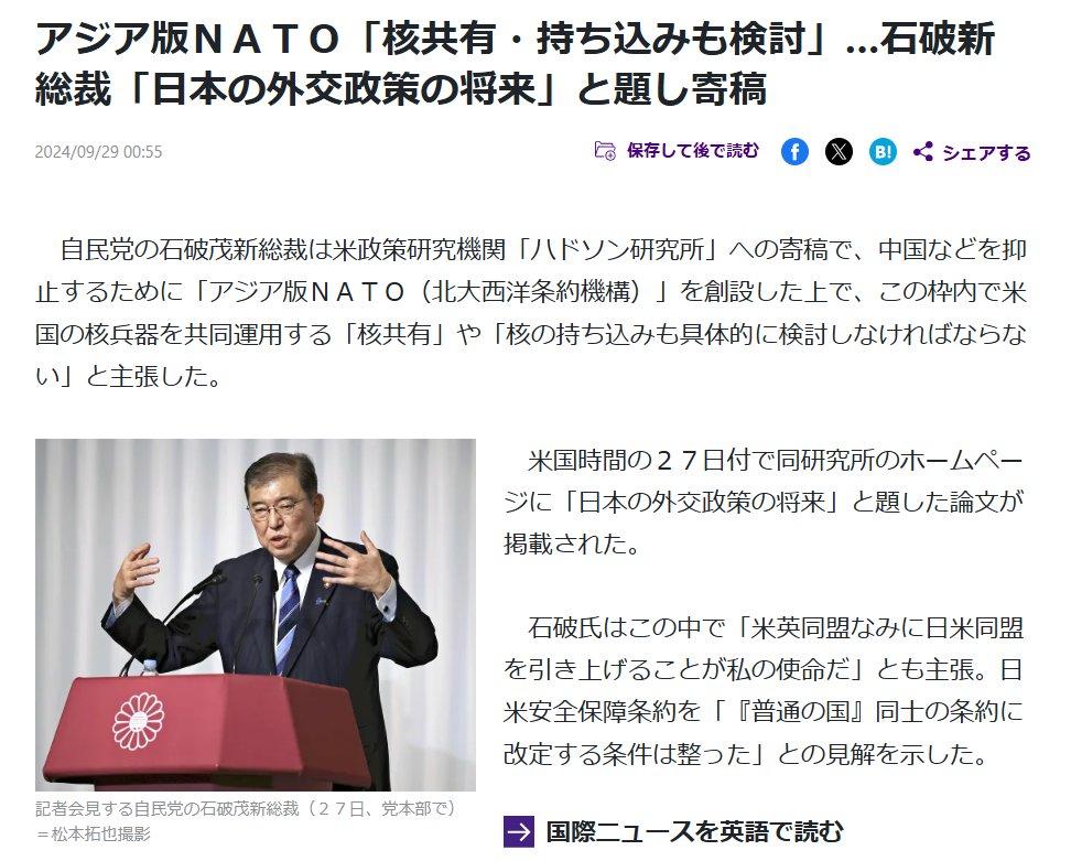 衆院選で大勝したことで「イデオロギー的な理想をかなえるための許可を得たと誤って解釈するかもしれない」として、人気に甘んじれば信頼を失う恐れがあるとも指摘した。靖国神社に参拝すれば対中関係のさらなる悪化につながり、アジアでの外交に影響するとの懸念にも触れた。もし、日本が核武装すると、その余波として、オーストラリア、ニュージーランド、カナダ、フィリピン、タイ王国、ヨーロッパ諸国、太平洋島嶼国、韓国なども雪崩を打って、核武装に走る可能性があると思われます。自存自衛は、世界共通の認識事項だと思われます😊