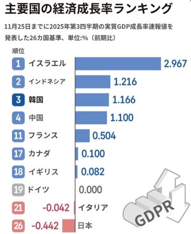 日本は成熟した先進国だから、経済成長が緩やかなんだよwwww>>1 2025년 3분기 주요국가 중에서 경제성장률 한국이 3위 일본은 26위로 꼴찌 ㅋㅋ