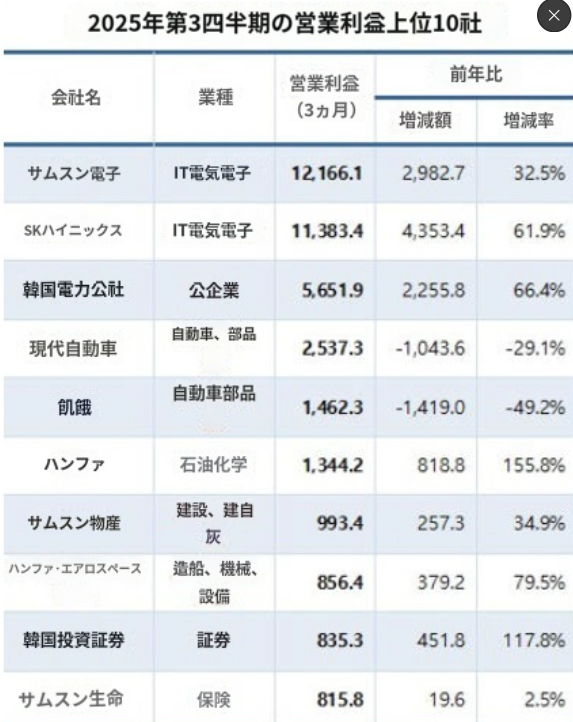 続いて韓国電力公社(5兆6519億ウォン)、現代(ヒョンデ)自動車(2兆5373億ウォン)、起亜(キア、1兆4623億ウォン)、ハンファ(1兆3442億ウォン)、三星物産(9934億ウォン)、ハンファエアロスペース(8564億ウォン)、韓国投資証券(8353億ウォン)、三星生命の順で営業利益規模が大きかった。