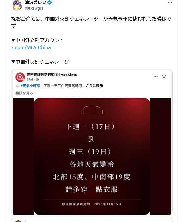 https://japan.focustaiwan.tw/politics/202511150006高市首相は、絶対発言を撤回しないだろうから、中国はどうやって振り上げた拳を下ろすのだろう?