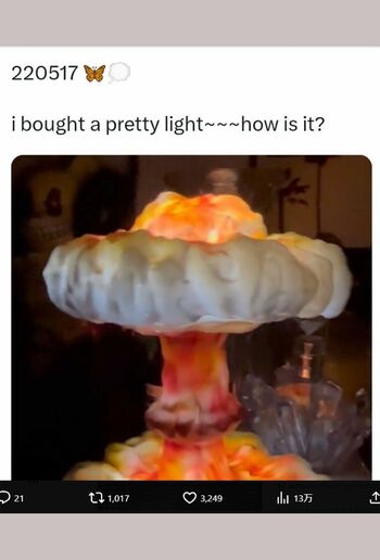 第二次世界大戦当時の広島と長崎の原爆投下を連想させるスタンドランプの写真を投稿し、「かわいいライトを買ったよ~~、どう?」というコメントを添えた。