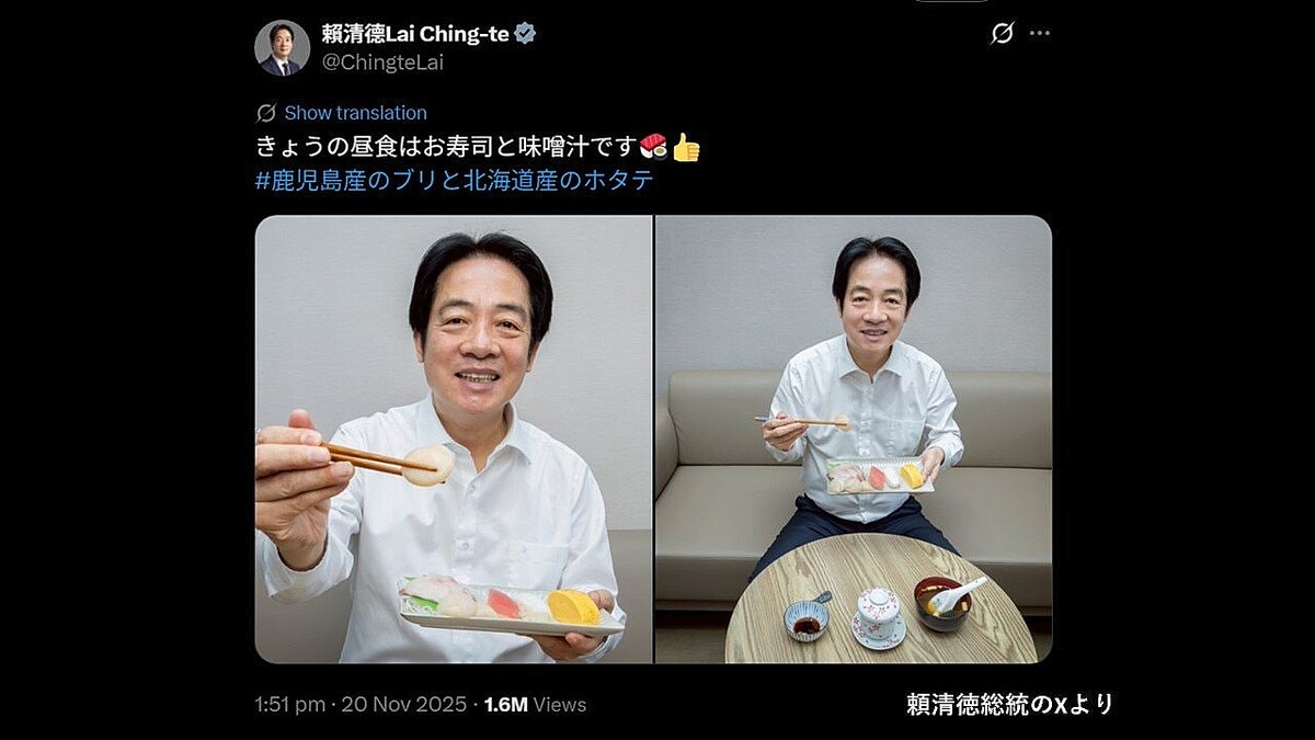 日本の高市早苗首相が「台湾有事」をめぐり台湾支持の姿勢を示したことに中国が反発し、日中間の緊張が高まるなか、中国政府は19日付で日本産水産物の全面輸入停止を発表した。こうした状況の中、台湾の頼清徳総統は20日、フェイスブックに昼食の写真を投稿し、食材が鹿児島県産のブリと北海道産のホタテだと明かした。日本産水産物への強い支持を打ち出した形で、「日台友好」「パイナップルの恩返しだ」といったコメントが多数寄せられ、日本人からの感謝の声も相次いでいる。