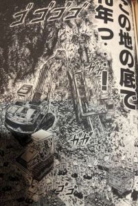 鉄筋構造物に敷かれたダントラックは大部分が歪んだが、鉄筋の重さが相当なことが分かります。写真を見ると、複数の鉄筋を垂直に交差させて作られた構造物がトンネル上端部に設置され、崩れ落ちたようです。