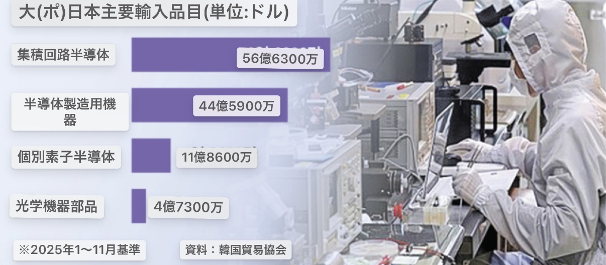 実際に韓国が日本から輸入する主要品目のほとんどには電気自動車・半導体など製造に不可欠な希土類が含まれている。韓国貿易協会によると、昨年1~11月基準集積回路半導体と半導体製造用機器の対日輸入額はそれぞれ56億6300万ドル、44億5900万ドルで対日輸入額上位1・2位を占めた。光学機器部品(4億7300万ドル)、その他の精密化学製品(4億6200万ドル)、自動車部品(3億8000万ドル)なども輸入額上位25位に含まれた。삼성·SK하이닉스, DRAM 가격을 최대 70%까지 인상