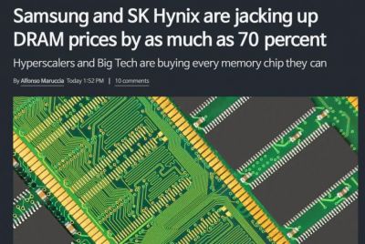 한국 소식통에 따르면, 삼성과 SK하이닉스는 AI 관련 금융 거품이 지속되는 동안 메모리 칩 가격을 인상할 의향이 충분히 있다고 합니다. 두 회사는 주요 고객사들에게 서버용 DRAM 가격이 작년 4분기 대비 최대 60~70%까지 인상될 수 있다고 통보한 것으로 알려졌습니다.