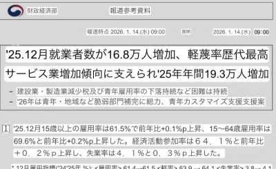 2026年01月14日、韓国の財政経済部が「’25.12月および年間雇用動向と評価」のデータを公表しました(以下はプレスリリース)。