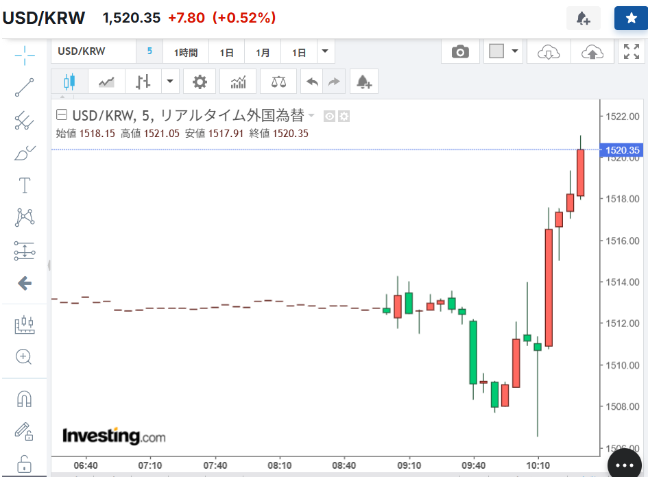 午後1時49分には1ドル=1536.5ウォンと、取引時間中としては世界金融危機時の2009年3月10日(1ドル=1561.0ウォン)以来約17年ぶりのウォン安水準を記録した。