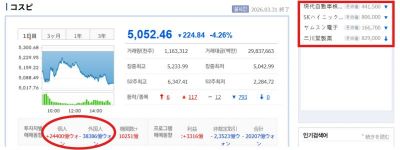 外国人投資家は3月の1カ月間、有価証券市場で35兆1581億ウォン(約3兆7100億円)を売り越したが、これは月次ベースで歴代最大だ。この日も外国人が3兆8423億ウォン相当を売り越した余波で、KOSPI(韓国総合株価指数)は前日比4.26%下落した5052.46で取引を終えた。ウリィ銀行のエコノミスト、パク・ヒョンジュン氏は「高油価の状況が沈静化しない場合、為替レートは1600ウォン水準まで上昇する可能性がある」と展望した。コスピ 5,386.04 333.58 +6.60%