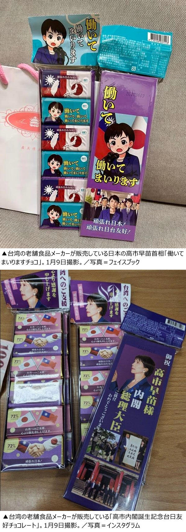 高市首相の発言がプリントされたチョコレートも販売されている。台湾老舗食品メーカーの義美食品は高市首相就任記念として「高市内閣誕生記念台日友好チョコレート」を関係者用に製造配布した。このチョコレートは高市首相へのお祝いの言葉がプリントされたバージョンに加え、日本で流行語となった「働いて働いてまいります」を印字したイラスト版まで製作する力の入れようだという。当初は非売品だったこの「高市チョコ」はニュースやSNSを通じて関心が高まり、12月初めから義美食品の直営店で注文販売を開始していると報じられた。