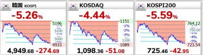 速報:コスピ売りサイドカー発動、5%暴落場中5000選崩壊