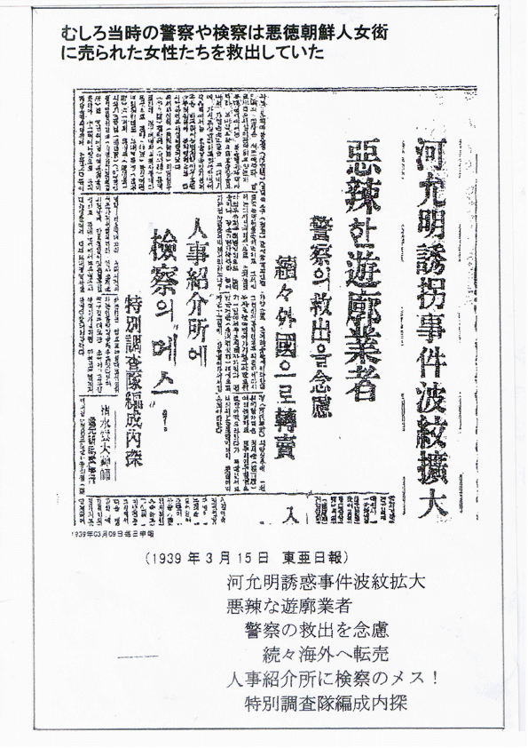 ・東亜日報(1935.03.07) 中国上海暗黒街に朝鮮人女性が約2000人、これら遠征売春婦のために朝鮮人の威厳が損なわれる。しかし、これに対策を打つことはできない なぜなら、経済的な問題で自発的に労働しているから