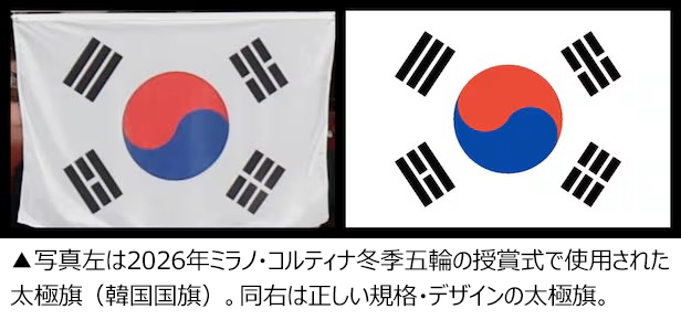 ミラノ・コルティナ冬季五輪ショートトラック競技の表彰式で、誤った模様の太極旗(テグッキ/韓国国旗)が掲揚されていた事実が、後になって確認された。