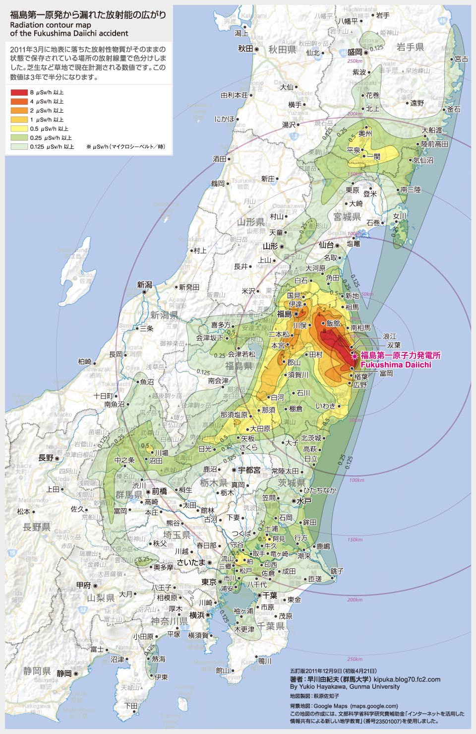 実際の汚染図(>>90)と比べると、ほぼ同心円なんだよ。(まだソースのソースを調べられていないけど)