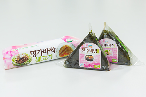 この春、韓国のコンビニでは、期間限定の桜エディションが商品棚を賑わせています。「GS25」では、お花見に欠かせない韓国海苔巻き(キムパッ)やおにぎりのデザインが桜仕様に!プルコギ海苔巻き(左、1,800ウォン)や全州(チョンジュ)ビビンバおにぎり(中央、800ウォン)など、韓国らしいラインナップも魅力です。