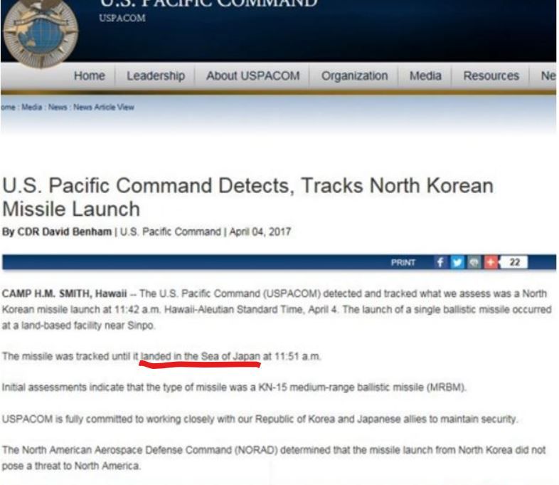 米国の軍当局が5日、北朝鮮が発射した弾道ミサイルが落下した海上を「日本海」と表記して議論が広がっている。